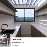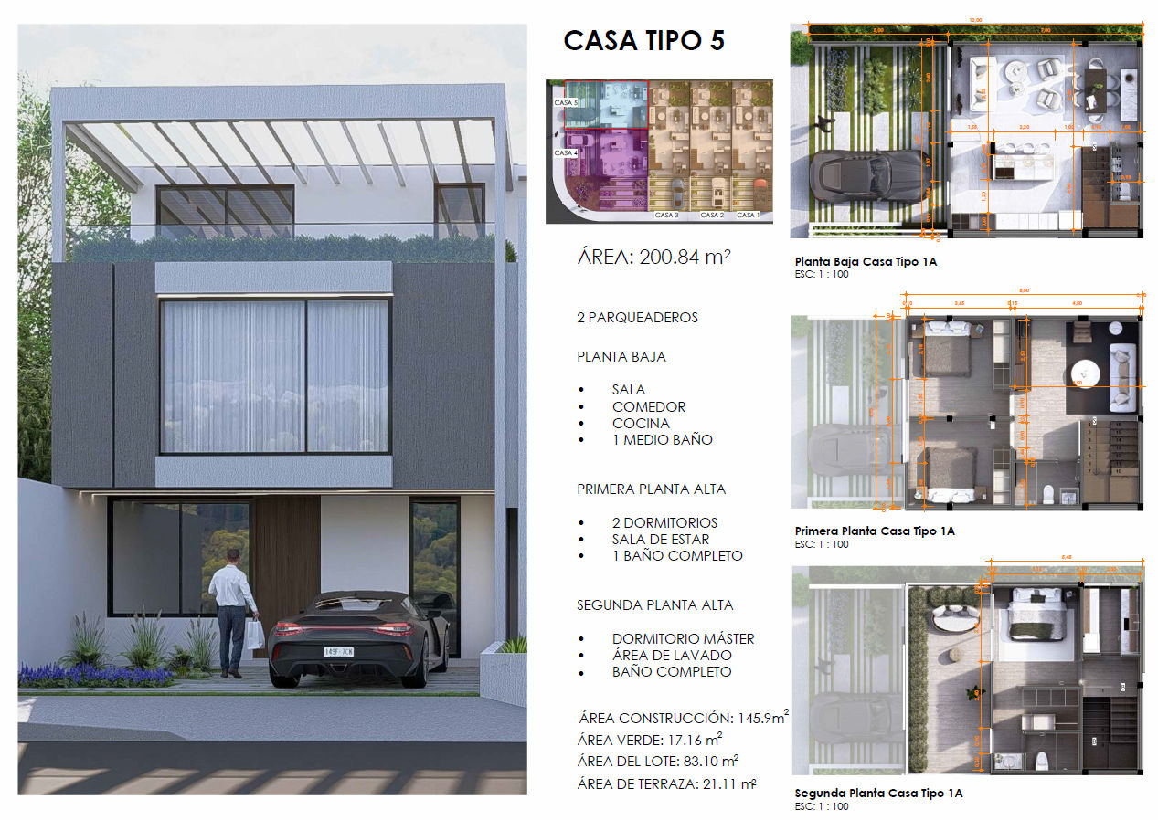 Vivienda 5 – tres pisos: 145,09 m² de construcción, 17,48 m² de estacionamiento, 21,11 m² de terraza y 17,16 m² de área verde. 3 dormitorios, sala, comedor y cocina integrados, 3 baños, 2 parqueaderos.
